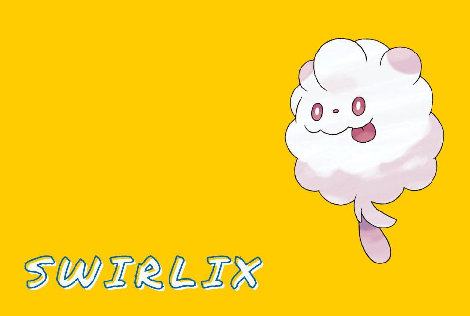 Swirlix’s name comes from Swirl and the deformation of the word Licks, probably because of its tongue. Swirlix Summary of Appearances in Pokémon Versions and Media (Games, Anime, Movies)