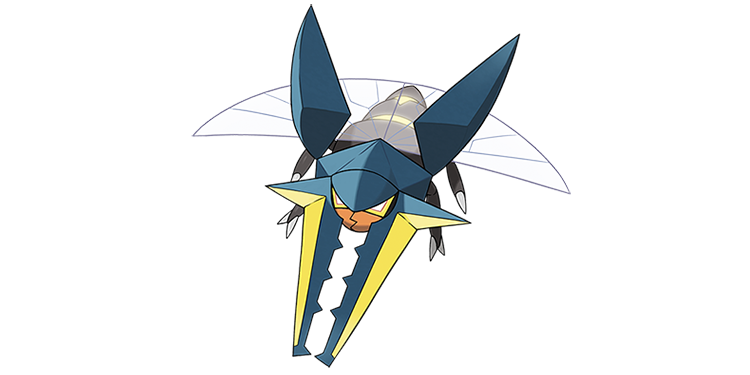 Vikavolt is a seventh-generation, bug, and electric type Pokemon. In terms of this Pokemon’s appearance, it is rather similar to a beetle, with a bug-like body shape and wings that protrude from the thorax of the creature. The Pokemon has a small, orange face and sharp yellow pincers that are equally as large as the rest of the creature.