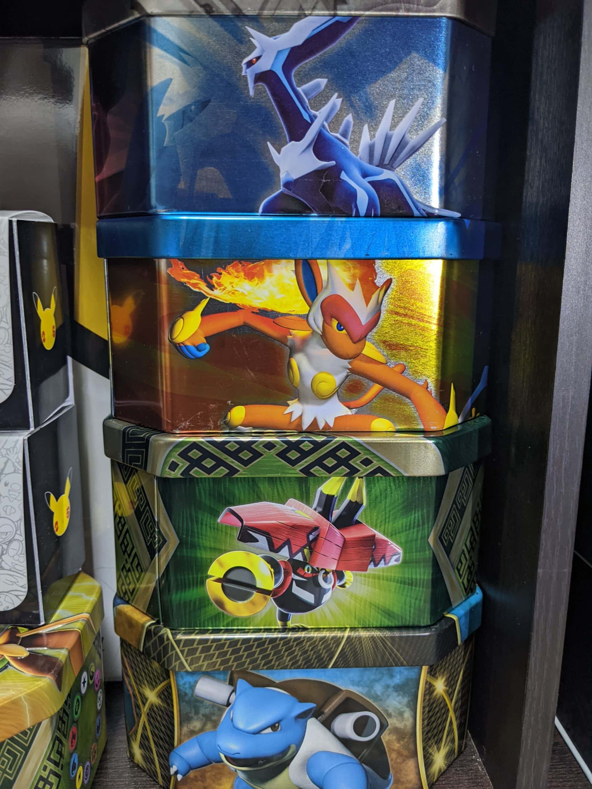 Both of the tins listed above are available to purchase at or a bit above MSRP. In my opinion, collecting classic-style tins is the best option for displaying Pokémon tins. Though this style was largely replaced at the beginning of the Sword & Shield era, you can occasionally find classic style tins at big box stores or local card shops, though they are becoming rarer.