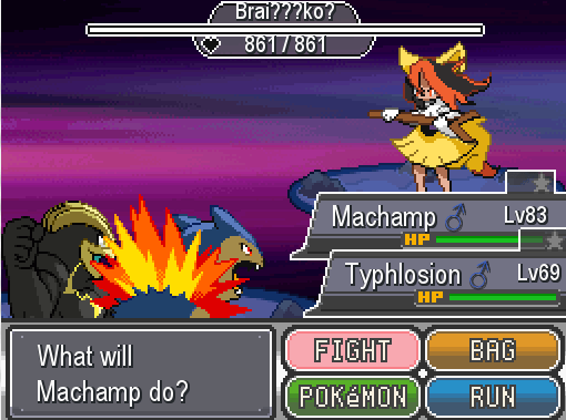 This is a fusion between a girl named Maiko and Braixen. This thing is called Braiko. It is Fire-type, so Ground-type is your best option, as well as some Water-type. It has 1000 HP as well as the three previous bosses. It has Energy Ball (Grass-type), Flamethrower (Fire), Earthquake (Ground), and Shadow Ball (Ghost).