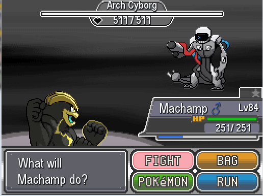 This is the fifth boss fight, a cyborg called Arch Cyborg that guards the Factory. It is Steel-type and has only 750 HP. It has Leftovers as its item and Download as its ability. The download will increase Arch Cyborg’s Attack if your defense is lower than its or increase its Special Attack if your Special Defense is lower than its or both Special and Physical Defenses are equal.