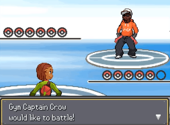 This gym is specialized in Dark and Fire-types, so once again, your Omuran Machop (or any other Fighting-type Pokémon) and Water-types (like a Gyarados) are perfect for this gym! Ashy’s team has a Mightyena (Level 26), Quilava (Level 29), and Houndoom (Level 27). Mighyena will fall with any Fighting-type attack, as well as Quilava and Houndoom with Water-type attacks.