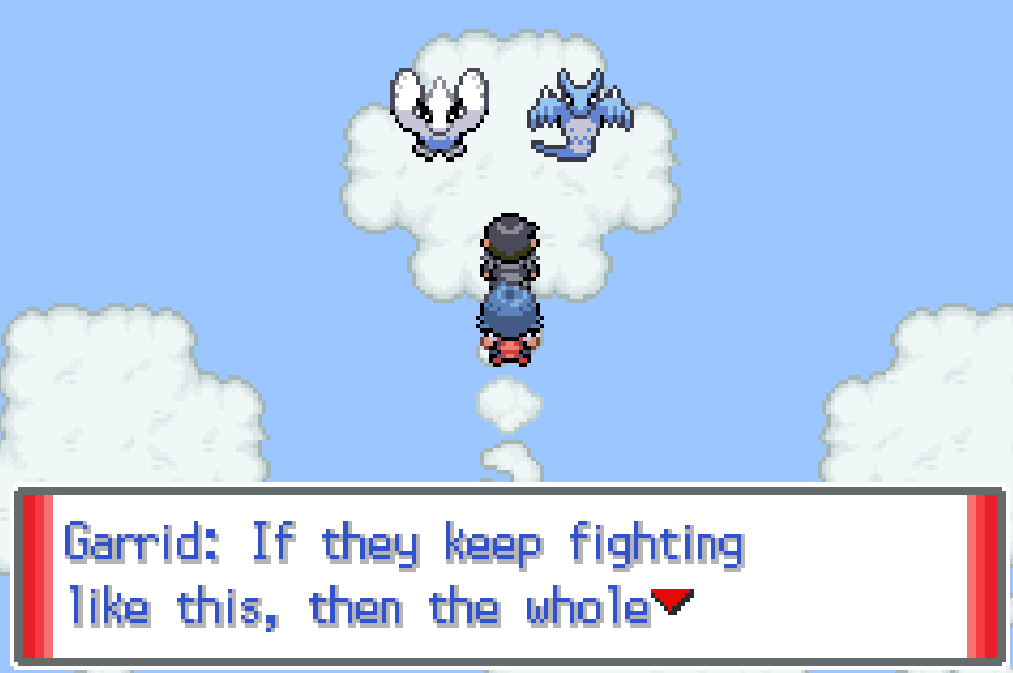 Even though you’re underground, prepare for a showdown in the… Clouds? There are a lot of Team Rocket Grunts here, but you’ll be grateful for the EXP. Fortunately, your team gets healed when you enter this area. There are no wild Pokemon, and there’s no way to get lost either; battle through until you reach Garrid, who’s busy watching Lugia and Gralite battle.